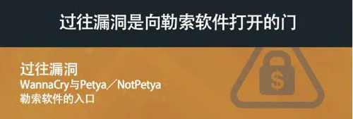 - 勒索型蠕虫攻击上升:WannaCry和NotPetya都针对了一个补丁刚发布不久的漏洞。 幸免于这样攻击的企业及组织机构有两个特点,一是已经部署了已更新的安全工具来检测针对此漏洞的攻击,并且/或者能够及时的将漏洞的补丁打好。 在WannaCry和NotPetya之前,网络蠕虫在过去十年中带来的威胁基本没什么了。