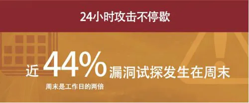 - 停机时间内攻击仍不会停:自动化的攻击是不论工作日还是休息日的。所有漏洞利用尝试中有近44%发生在星期六或星期日。 周末的平均日量是平日的两倍。