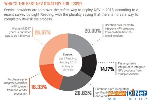 咨询调研显示,运营商倾向于选择由同一个NFV系统预集成商进行NFV解决方案的集成交付。集成商有IT背景也有CT背景,据C114了解,在NFV网络部署之初,部分国际运营商选择了IT背景的集成商,例如Telenor、德国电信,但在具体部署时表现差强人意。IT厂商不了解电信网络、只是作为一个行业来对待的弱点暴露无遗。