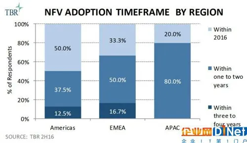 来自TBR Research的最新报告显示,全球的电信运营商都在不断发展NFV,但美洲地区的电信运营商发展最快,这得益于美国的大规模采用。在亚太地区,参与调查的电信运营商中只有20%表示将在今年内采用NFV技术,而剩下的80%受调查的电信运营商计划在未来的一两年内采用NFV技术。