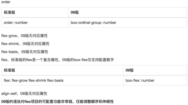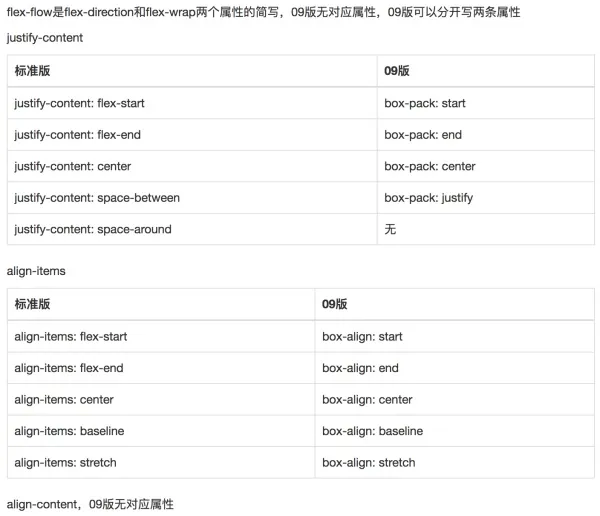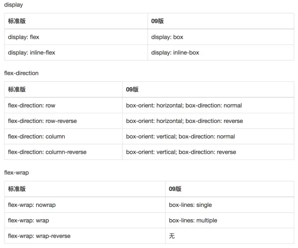 通过上面的目标和caniuse,很容易得出我们需要写09和标准两版语法,只有在两版语法中都存在属性才能使用,下面给出两版语法的对照关系,注意这不是语法指南,语法指南请看结尾处的推荐资料