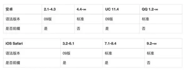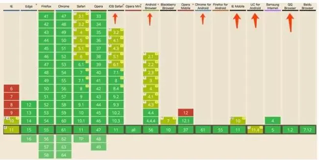 上图中红色箭头代表我们应该兼容的浏览器情况,在国内,UC和QQ浏览器的份额不容忽视,上图中的 1 2 3 其实代表flex的三版语法,flex有09年版语法,11年版语法和标准语法;右上角带黄色小方块的代表需要添加-webkit-前缀