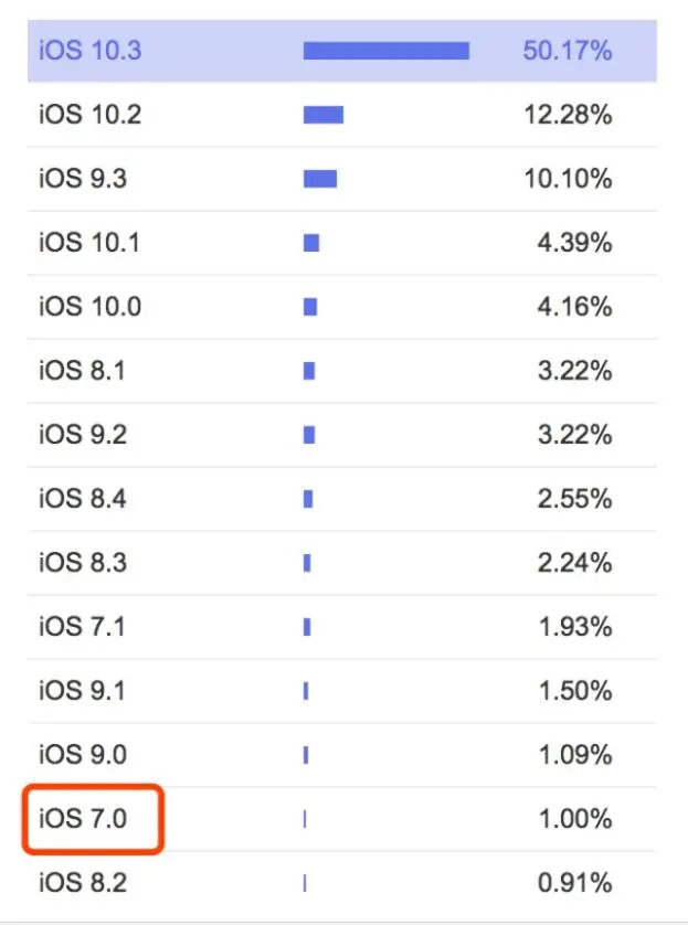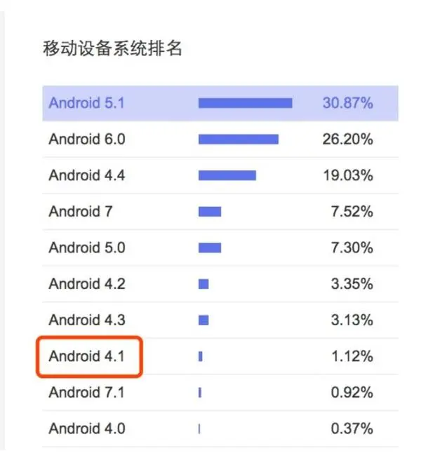 再来看一下百度给出的移动设备的统计情况,分别是安卓和ios,可以发现现在需要兼容安卓4.1+,IOS7+,这里百度给出的数据,当然你应该根据自己产品的统计情况来确定兼容情况
