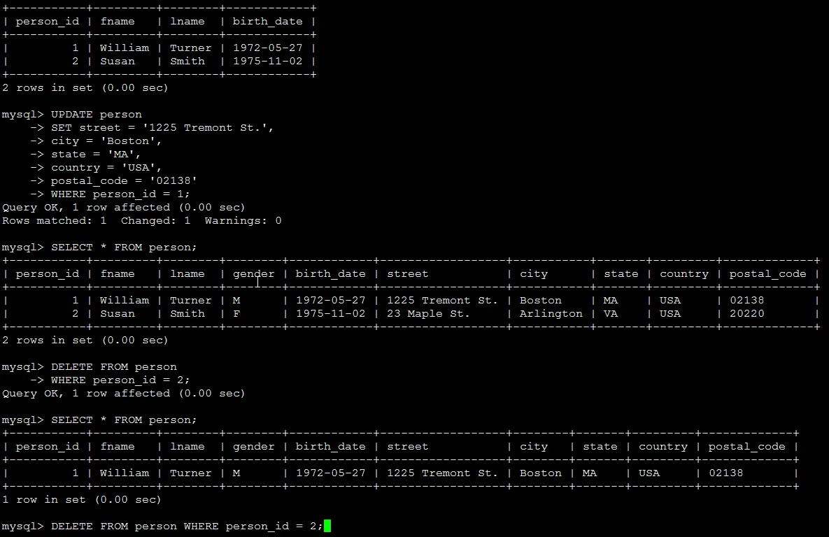 UPDATE person SET street = '1225 Tremont St.', city = 'Boston', state = 'MA', country = 'USA', postal_code = '02138' WHERE person_id = 1;