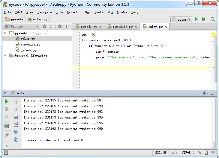 sum = 0; for number in range(1,1000): if (number % 3 == 0) or (number % 5 == 0): sum += number print 'The sum is:', sum, 'The current number is', number