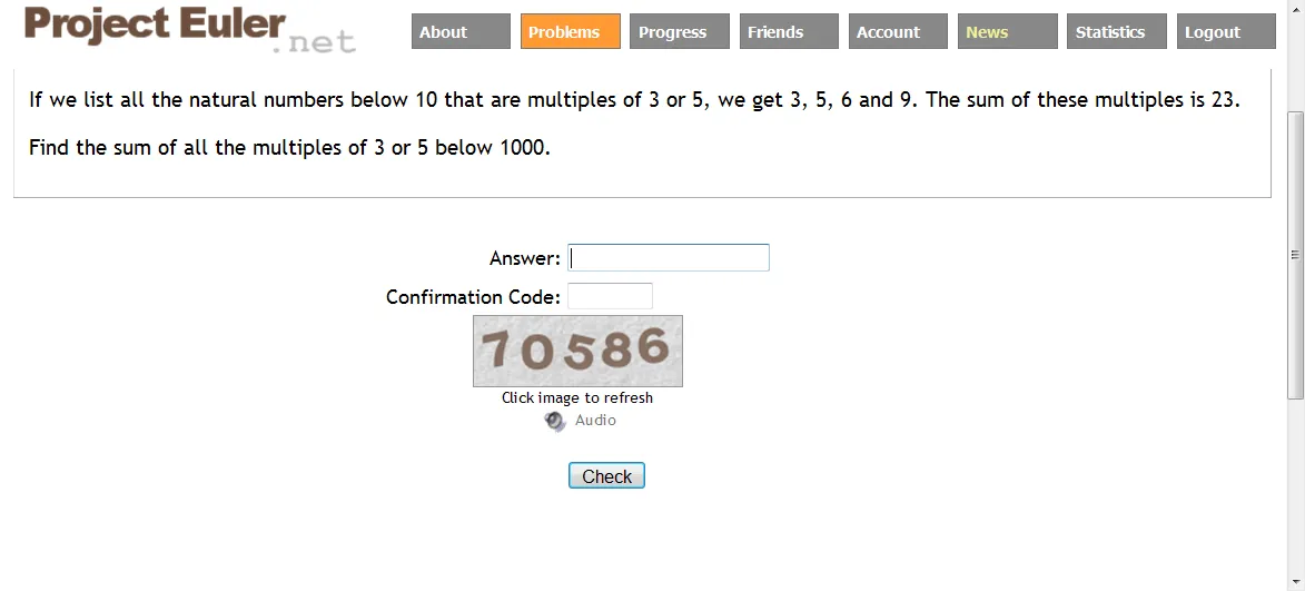 Published on Friday, 5th October 2001, 06:00 pm; Solved by 368828If we list all the natural numbers below 10 that are multiples of 3 or 5, we get 3, 5, 6 and 9. The sum of these multiples is 23.