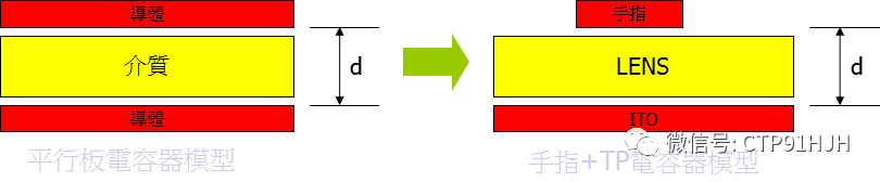 1.當觸摸TP時,手指與TP就組成了一個平行板電容器: