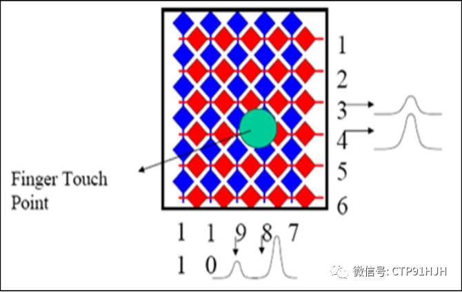 5. 受触的ITO線路將此電流值回傳給搭配IC的運算,IC就計算出哪一條ITO的電流值,就能計算出觸控點所在的位置.