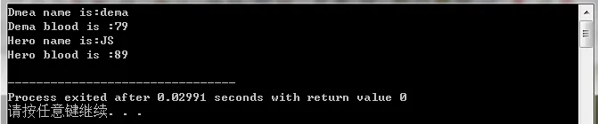 #include <iostream> #include <cstring> using namespace std ; //英雄联盟类 class Hero { private : int blood ; string name ; public : Hero(int blood = 100, string name = "man wang") { this->blood = blood ; this->name = name ; } ~Hero() { if(this->blood < 0){ cout << "Hero blood error!\n" << endl ; return ; } cout << "Hero name is:" << this->name << endl ; cout << "Hero blood is :" << this->blood << endl ; } }; //德玛类,继承于英雄类 class Dema : public Hero { private : int blood ; string name ; public : Dema(int blood , string name); ~Dema(); }; //在实现子类的构造函数时,可以同时向父类的构造函数传参 //例如这个例子的 : Hero(58,JS),相当于向父类的构造函数传参 //当然,子类也可以给本类的的成员传参 Dema::Dema(int blood , string name) : Hero(89 , "JS") , blood(58) , name("dema") { this->name = name ; this->blood = blood ; } Dema::~Dema() { if(this->name != "dema"){ cout << "This Hero are no dema!" << endl; return ; } if(this->blood < 0){ cout << "Dema blood error!\n" << endl ; return ; } cout << "Dmea name is:" << this->name << endl ; cout << "Dema blood is :" << this->blood << endl ; } int main(int argc , char **argv) { Dema player1(79,"dema"); return 0 ; }运行结果: