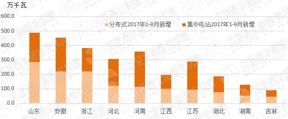 其次,国内分布式光伏新增市场分布广泛与集中度高特征并存,除了西藏、港澳台以外,其他所有省市区都有一定的安装量。今年前三个季度,分布式光伏超过100万千瓦的省份有5个,占比63%,排名前十的省份占比达到了87%,基本上还是以东中部为主。排名前十的省份不仅分布式光伏市场量大,它们集中式光伏在新增市场中的占比也达到了55%,可以说无论是集中式光伏电站还是分布式光伏,山东、安徽、浙江、河南、河北、江西、江苏、湖北、湖南、吉林等省份都是比较热点的区域。