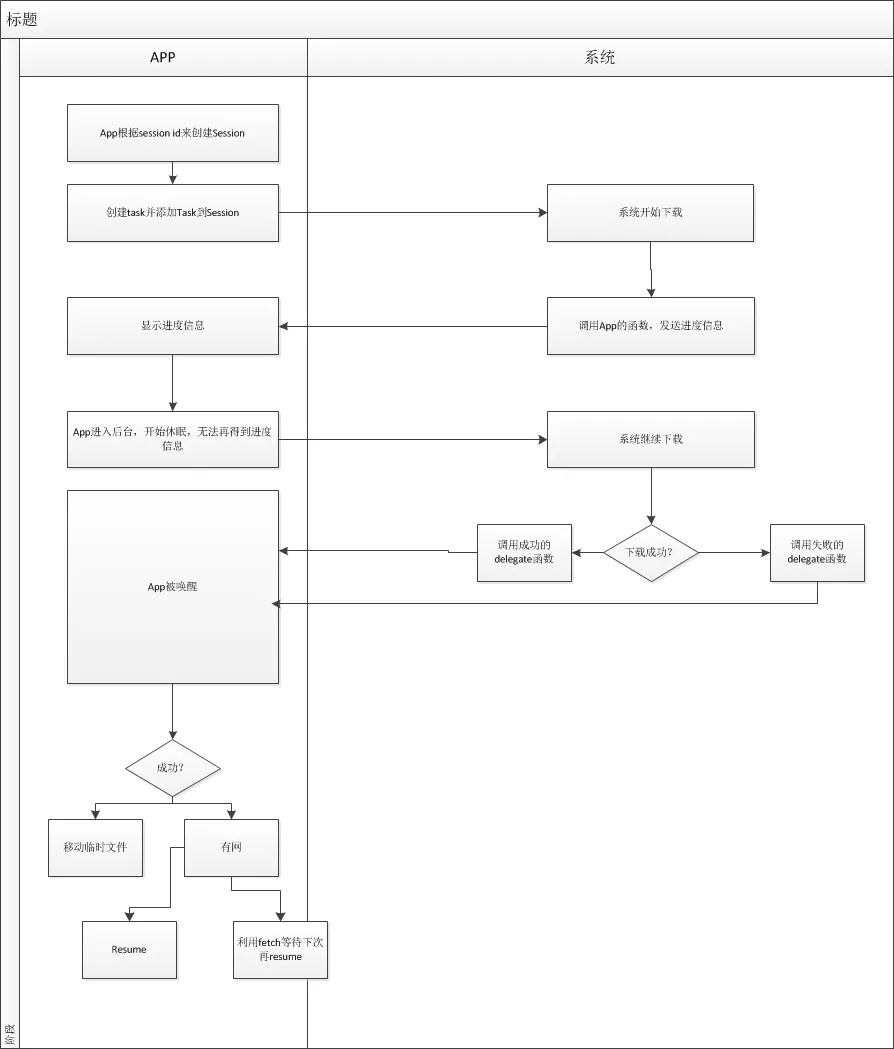 这种方法的名字很容易让人误解,以为是App进入后台时,使用这种方法进行数据传输。实际上,这种方法与后台无关。 当App使用了这种方法后,可以将一个下载任务交给系统的独立进程去下载,不管App在前台、休眠、以及crash,下载过程都在进行,因为是系统的独立进程在为App进行下载。当系统的下载任务结束或者出错时,系统会唤醒App,调用其中的函数,让App做一部分处理,比如让App重新添加其他任务。这里有一个缺点就是,如果因为没有网络导致系统下载失败了,系统即使唤醒了App,App也是没有办法下载的,然后App会进入休眠,即使后面有了网络,系统也不会继续下载,因为只要系统向App发出了失败的信号,除非App 调用resume函数来恢复下载过程,系统是不会自己恢复下载的。这里就需要用到前面提到的fetch后台模式,让App过一段时间被系统唤醒,然后App就可以去检查网络,当有网时恢复下载过程。