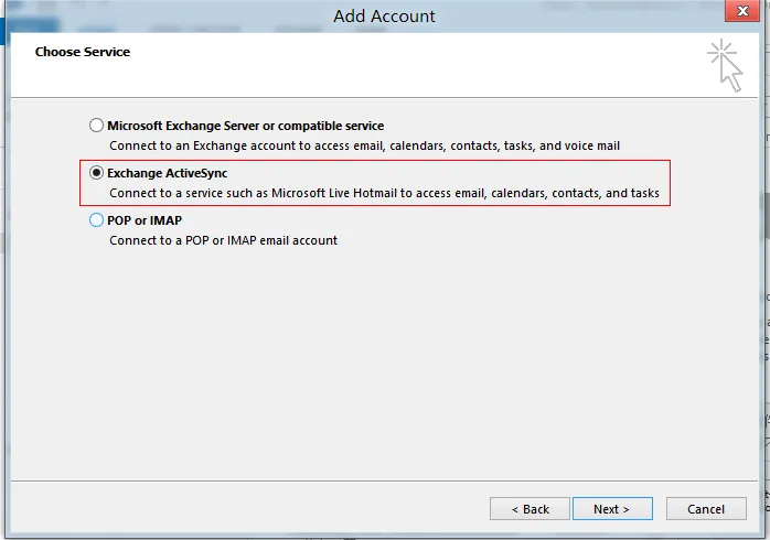 - 选择“Outlook.com 或 Exchange ActiveSync 兼容的服务(A)”,"下一步”。英文版:“Exchange ActiveSync”,“Next”;