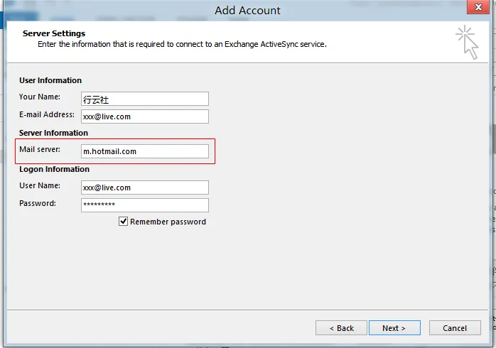 - 根据实际情况进行内容填写,在“服务器信息” 一栏中填写m.hotmail.com,“下一步”。