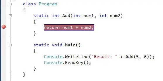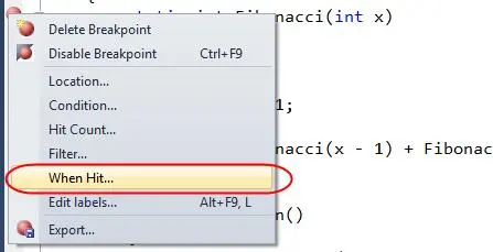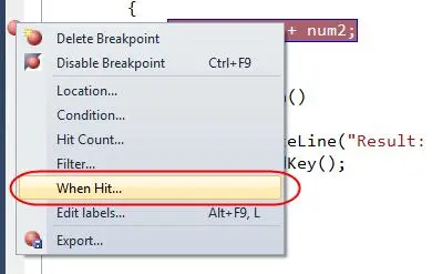 上述代码中,我们用F9在“Add”方法的返回值处加了个断点,然后右击断点,在弹出菜单上选择“When hit”。