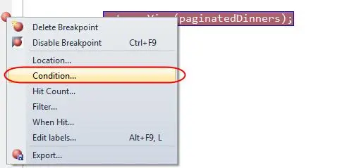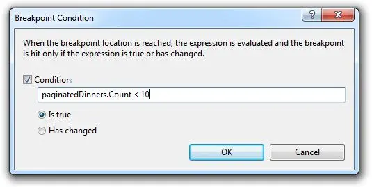 这时弹出一个对话框供你设置激活该断点所需的条件。比如:我们希望只有当局部变量paginatedDinners的尺寸小于10时,调试才中断。我们可以写出如下的表达式: