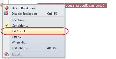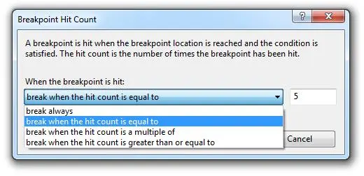 有时你希望,只有当第N次满足条件的运行到达断点时,才中断程序运行。例如:当第五次返回少于10份晚餐的查询结果时,中断程序运行。