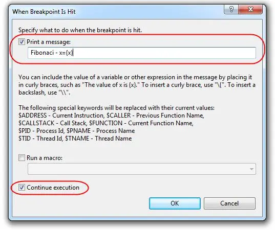 在上例中,我们同时选中了底端的“continue execution“选项,这说明我们不希望程序中断调试状态,而是继续运行。唯一的不同是:每次断点条件满足时,我们的自定义追踪信息都将被输出。
