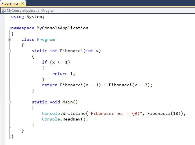我将用一个简单的控制台程序来演示如何使用“跟踪点”。如下是斐波那契数列的一个递归实现: