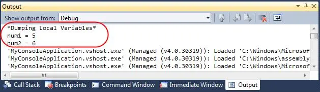 现在按F5运行程序,当“Add”方法被调用时,我们会在Visual Studio的“输出”窗口中看到如下结果。注意命中跟踪点时,宏会自动列出每个局部变量的名称和值: