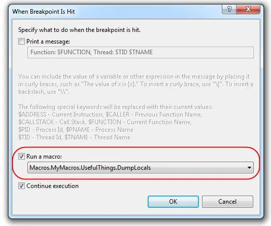 将显示如下对话框。和之前不一样, 我们不选“Print a message”选项,也不手工设定需要输出的变量;而是选择“Run a marco”复选框,并指定到我们上面创建的UsefulThings.DumpLocals宏上: