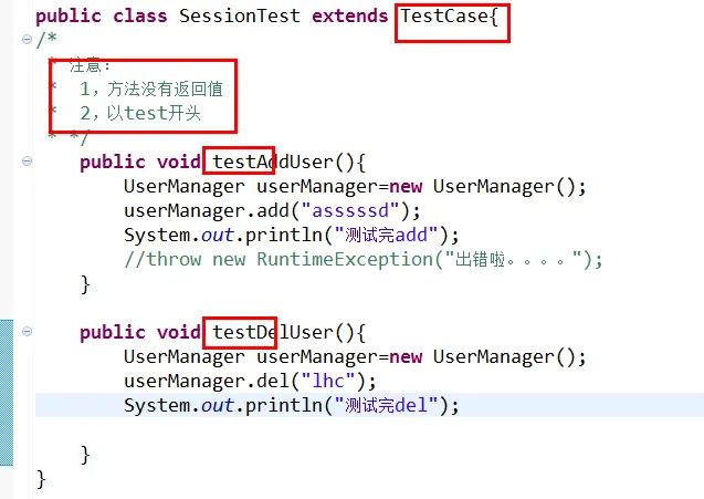 测试类继承TestCase类,下面为UserManager中每一个方法加入测试方法,方法以test开头,没有返回值。