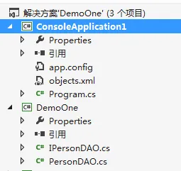 <?xml version="1.0" encoding="utf-8"?> <configuration> <!--配置处理节点的处理类--> <configSections> <sectionGroup name="spring"> <section name="context" type="Spring.Context.Support.ContextHandler,Spring.Core"/> <section name ="objects" type="Spring.Context.Support.DefaultSectionHandler,Spring.Core"/> </sectionGroup> </configSections> <!-- spring配置--> <spring> <!--配置方式二:将所有配置保存在应用程序配置文件中--> <context> <resource uri="config://spring/objects"></resource> </context> <objects> <object id="PersonDAO" type="DemoOne.PersonDAO,DemoOne"/> <!-- 配置要生成的类--> </objects> </spring> </configuration>