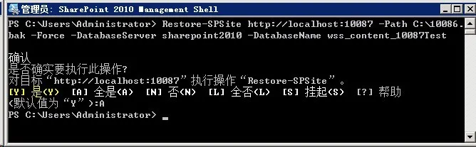 还原网站命令:Restore-SPSite http://localhost:10087 -Path C:\10086.bak -Force -DatabaseServer sharepoint2010 -DatabaseName wss_content_10087Test