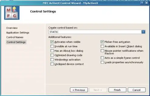 - In the MFC ActiveX Control Wizard dialog, as shown in Figure 2, select Control Settings.