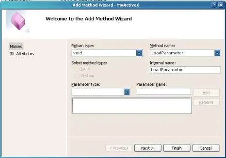 voidfor Return type and enter “LoadParameter” for Method name. The wizard will automatically enter “LoadParameter” for Internal name. Click Finish where the wizard will automatically create the code to support this method.
