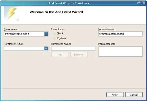 CMyActiveXCtrl, select Add, Add Event. In the Add Event Wizard, as shown in Figure 11, enter “ParameterLoaded” for Event name and change Internal name to “FireParameterLoaded”. Click Finish for the wizard to create the default code to support this event.