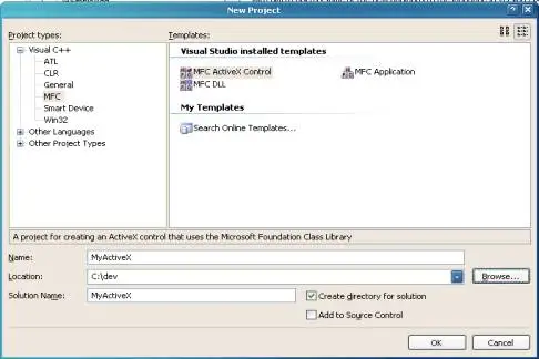 - In the New Project dialog, as shown in Figure 1, under Project types, select Visual C++, MFC. Under Templates, select MFC ActiveX Control.