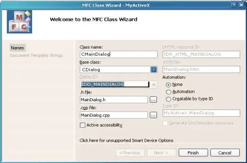 CMainDialog, with the base classCDialog. ClickFinish for the wizard to create the default source files for the class.