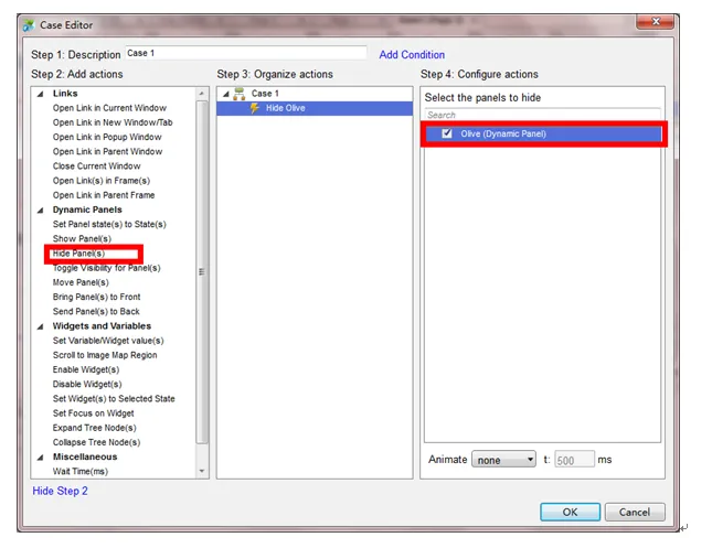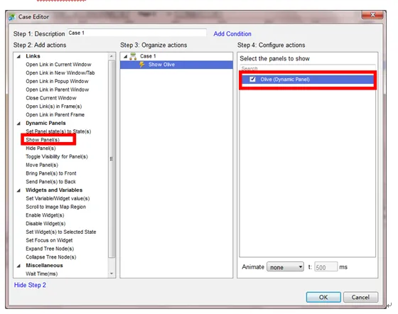 红框标识部分“show panel”即为弹出动态面板,后边Step4中要记得勾选我们要显示的动态面板,这里也就是我们之前起的名为”Olive”的动态面板。点击确认就OK了。