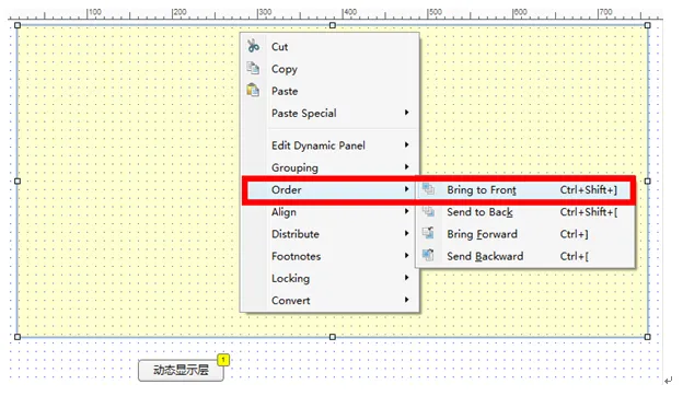 这里基本上就把设计中的一些心得给大家讲了一下,下面就讲一个在设计过程中遇到的问题,在进行动态面板的显示时,有时会遇到有些元素动态面板无法遮盖的情况,这是因为你在元素放置时先放了动态面板,后放了元素,因为这个原型设计工具是按层显示的,你后来放的元素在最上层,所以动态面板无法遮盖住,那如何解决这个问题呢?如下图红框所示,选择Order->Bring to Front,意思为将动态显示层放在最上边,这样就可以很好的解决了元素无法遮盖的情况。另外,因为我用到是英文版的,网上有很多中文版插件或者破解版之类的,如果对英文不感冒的朋友可以下载中文版的来用。