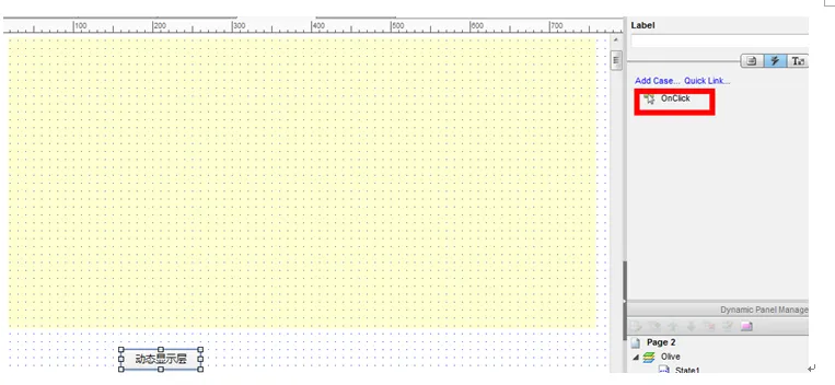e) 设置过后动态面板区域变成浅黄色,这时我们要选中“显示动态面板”按钮,然后双击又侧的Onclick事件,如下图所示: