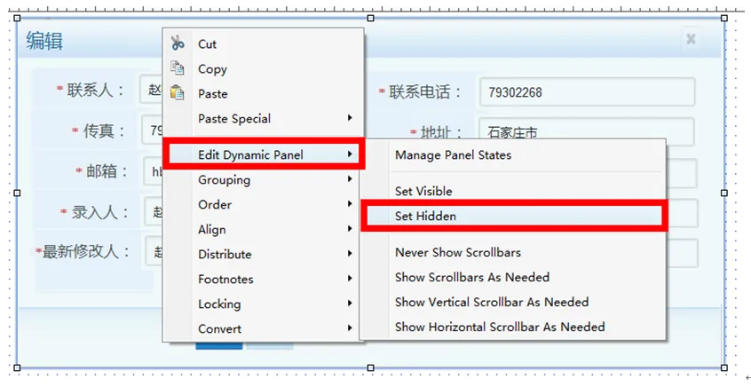 d) 然后我们再点击右键,选择编辑动态面板,将该面板设为隐藏如下图所示
