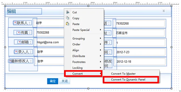 b) 我们将要动态显示的层选中,也就是除“动态显示层”以为的部分,然后点击右键选择Convert,进而选择Convert to Dynamic Panel,即将所选中的元素转换为动态面板