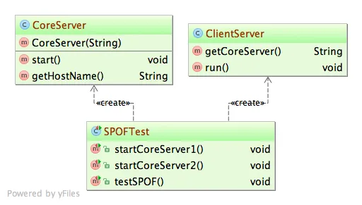 上面是类图,CoreServer类对应核心服务器,ClientServer类对应客户端应用服务器,SPOFTest为单元测试类