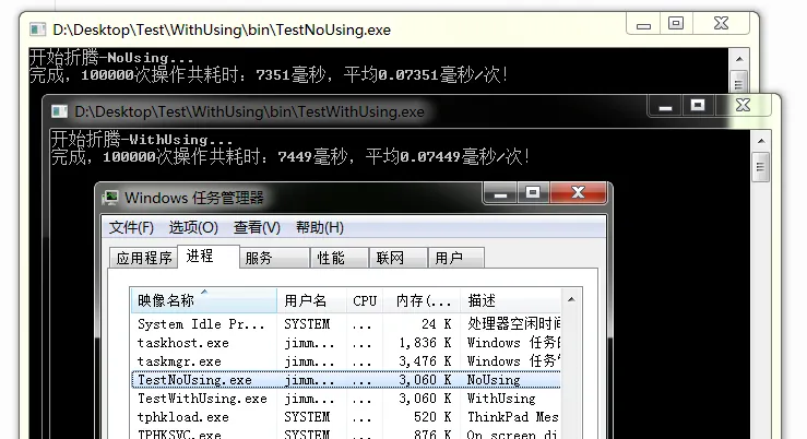 编译后,同时运行这二个程序,同时利用任务管理器观察内存使用情况:
