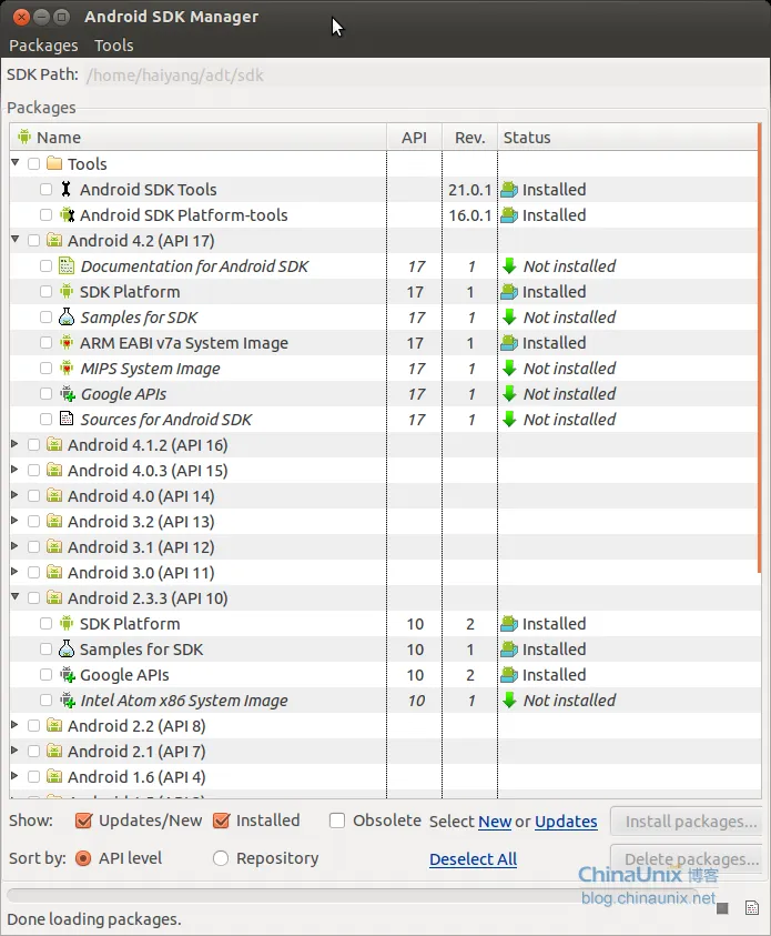 更改完成之后,重新启动一下eclipse软件,然后按照之前的操作,打开sdk manager,你会发现现在就能够很快的得到sdk和其他软件包列表。如下图所示:
