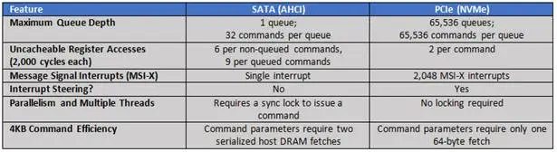 表2比较了基于其高级主机控制器接口(AHCI)与PCIe协议和NVMe标准的SATA协议的关键特性