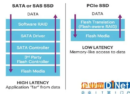 图1 SATA和SAS SSD与PCIe SSD的软件堆栈的比较