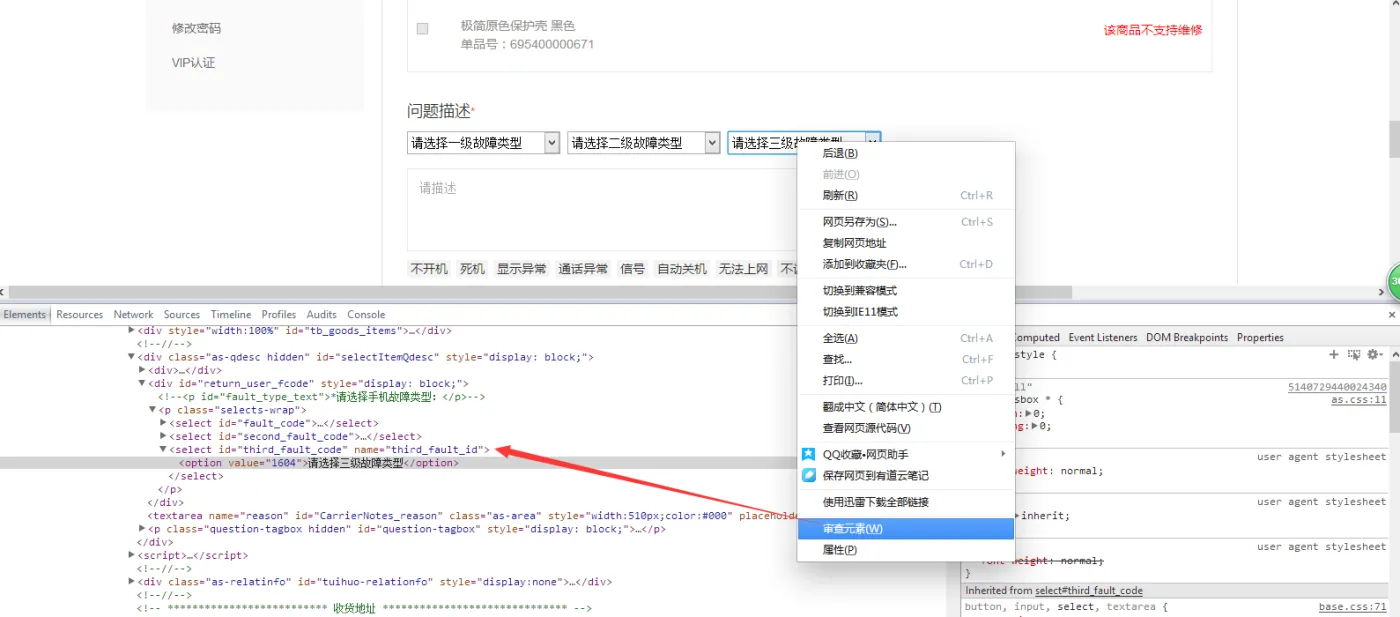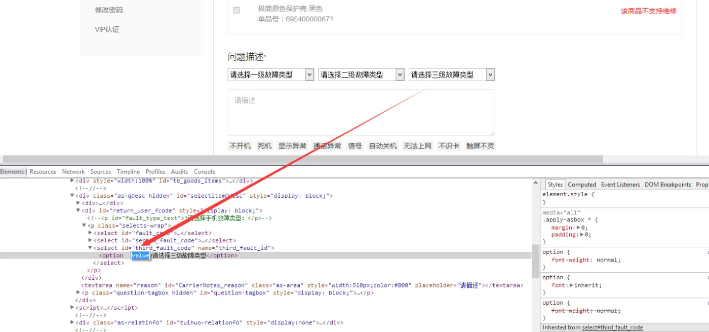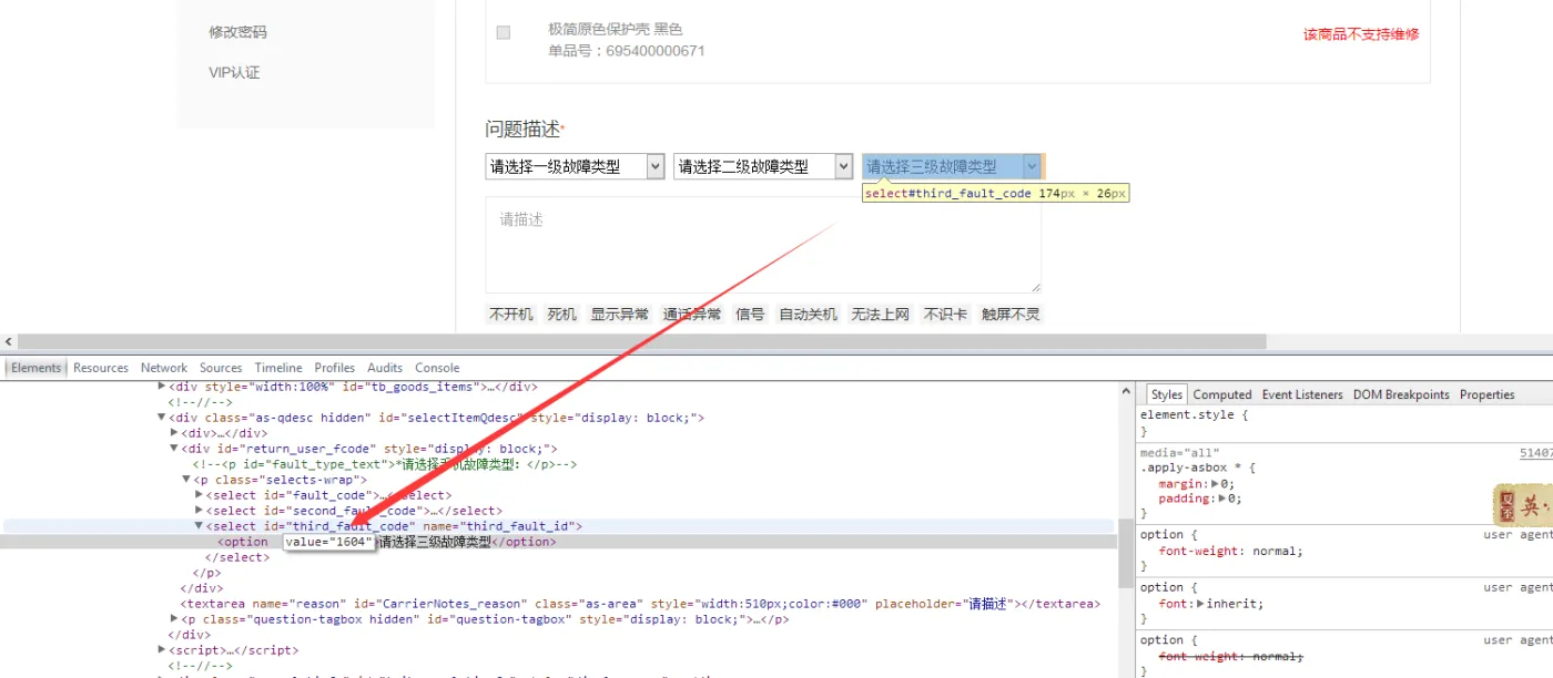 2.用谷歌浏览器或者360极速浏览器,对着 【 选择三级故障类型】右键,查看元素/审查元素,然后就可以看到代码,里面只有一个value,是没有值的,我们现在加上一个,你双击value这个单词,就出现一个编辑框,你随便写一个value="1602",然后鼠标随便离开代码区,就ok