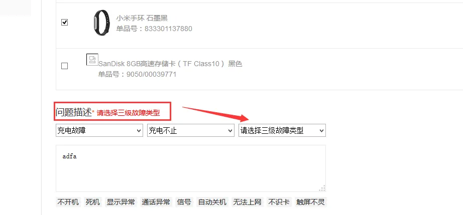 小米售后三级故障类型填不了
