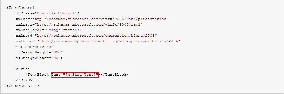 <UserControl x:Class="Controls.Control1" xmlns="http://schemas.microsoft.com/winfx/2006/xaml/presentation" xmlns:x="http://schemas.microsoft.com/winfx/2006/xaml" xmlns:local="using:Controls" xmlns:d="http://schemas.microsoft.com/expression/blend/2008" xmlns:mc="http://schemas.openxmlformats.org/markup-compatibility/2006" mc:Ignorable="d" d:DesignHeight="300" d:DesignWidth="400"> <Grid> <TextBlock Text="{x:Bind Text}"></TextBlock> </Grid> </UserControl>