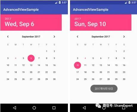 android:calendarViewShown:设置该日期选择是否显示CalendarView组件。