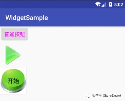 <?xml version="1.0" encoding="utf-8"?> <LinearLayout xmlns:android="http://schemas.android.com/apk/res/android" android:orientation="vertical" android:layout_width="match_parent" android:layout_height="match_parent"> <!-- 普通文字按钮 --> <Button android:layout_width="wrap_content" android:layout_height="wrap_content" android:text="普通按钮" android:textSize="16sp" android:textColor="#ff00ff"/> <!-- 图片按钮--> <Button android:layout_width="80dp" android:layout_height="80dp" android:background="@drawable/play" /> <!-- 带文字的图片按钮--> <Button android:layout_width="80dp" android:layout_height="80dp" android:background="@drawable/button" android:textSize="18sp" android:text="开始"/> </LinearLayout>