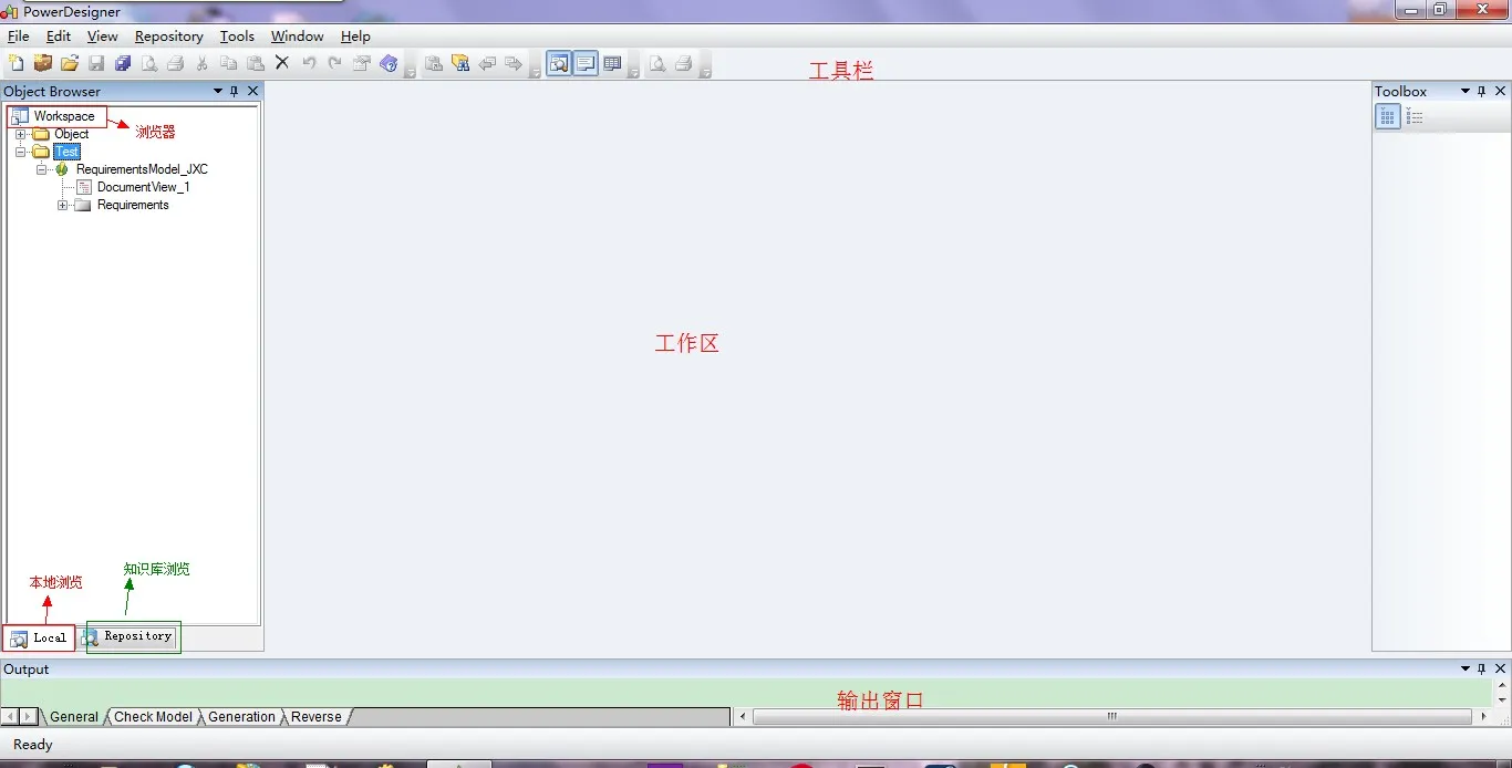 其中标准工具条、预定义图形符号工具条和各种建模工具选项板 已全部集成在Toolbox工具栏中了