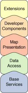 在图中我们可看出,ArcEngine的开发体系是一条纵线,功能丰富,层次清晰。最上层的Extensions包含了许多高级开发功能,如GeoDatabase Update、空间分析、三维分析、网络分析、Schematics逻辑示意图以及数据互操作等。ArcEngine标准版并不包含这些ArcObjects许可,他们只能作为扩展存在,需要特定的License才能运行。