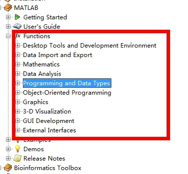 2.使用Matlab Help浏览器,打开核心组件Matlab的Functions节点,可以看到下面这些函数分类: